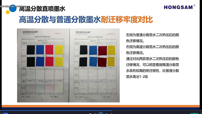 高溫分散染料墨水具有優(yōu)異的色牢度等優(yōu)點,能夠很好解決熱轉印工藝不耐高溫、色遷移牢度差等問題,避免集裝箱長途運輸過程中或在成衣熨燙過程中發(fā)生二次升華搭色等情況造成的巨大損失。