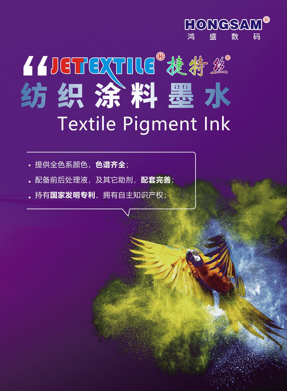 “捷特絲 ”紡織涂料墨水作為鴻盛紡織類墨水中的“亮劍”產品,憑借著的色彩和牢度,以及流暢性和穩定性,在多個應用領域被廣泛長期使用,得到了客戶的高度認可。擁有EPSON噴頭專用墨水,以及理光、精工、柯美、京瓷、星光等工業噴頭專用墨水。鴻盛數碼希望基于自有知識產權的專利技術、高品質紡織涂料墨水、強有力的印染技術及服務團隊,在涂料數碼印花領域保持持續領先。