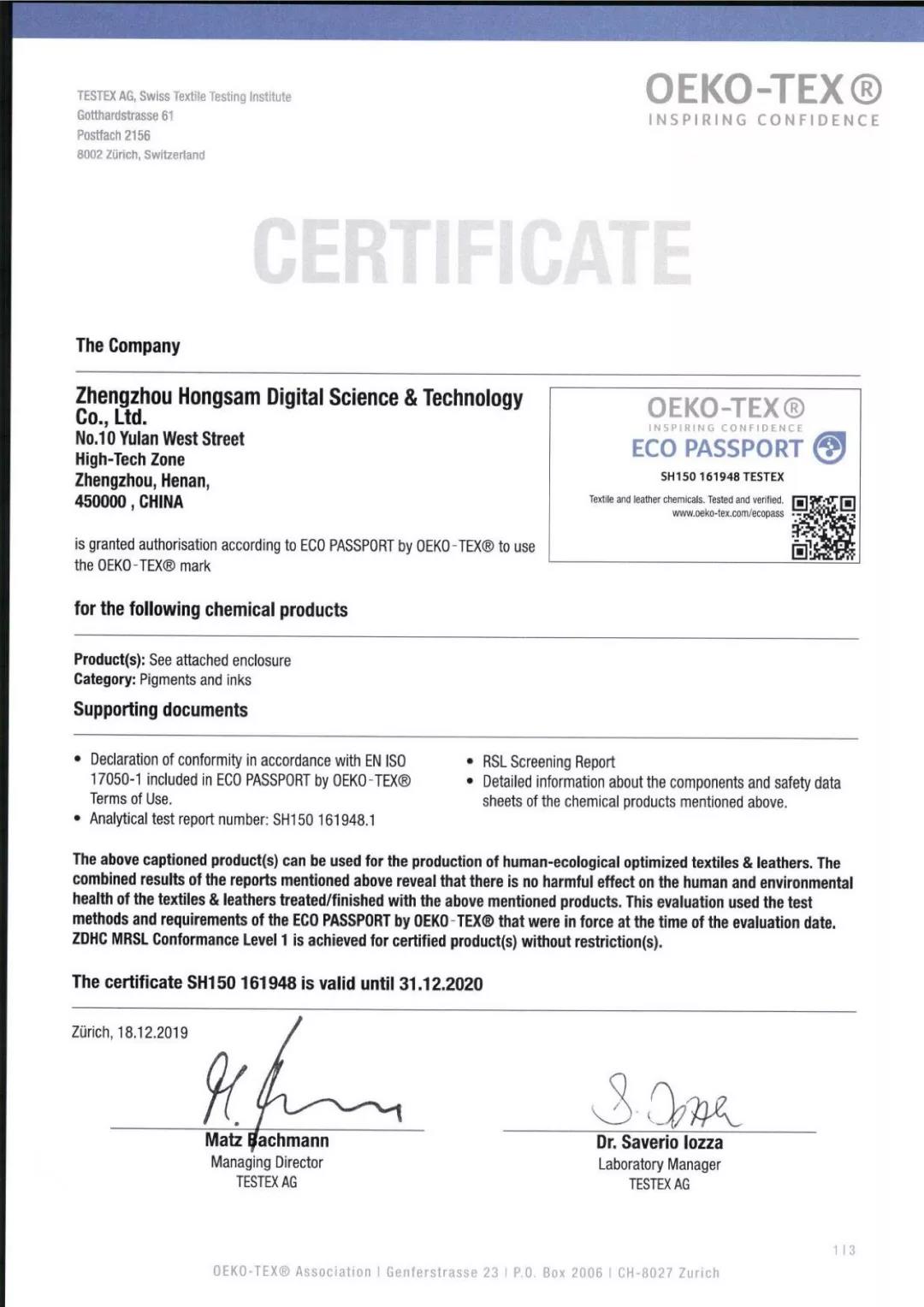 這表明:鴻盛數碼捷特絲®(Jettextile®)墨水完全符合歐盟紡織品生態環保要求,獲得了歐盟綠色環保通行證。