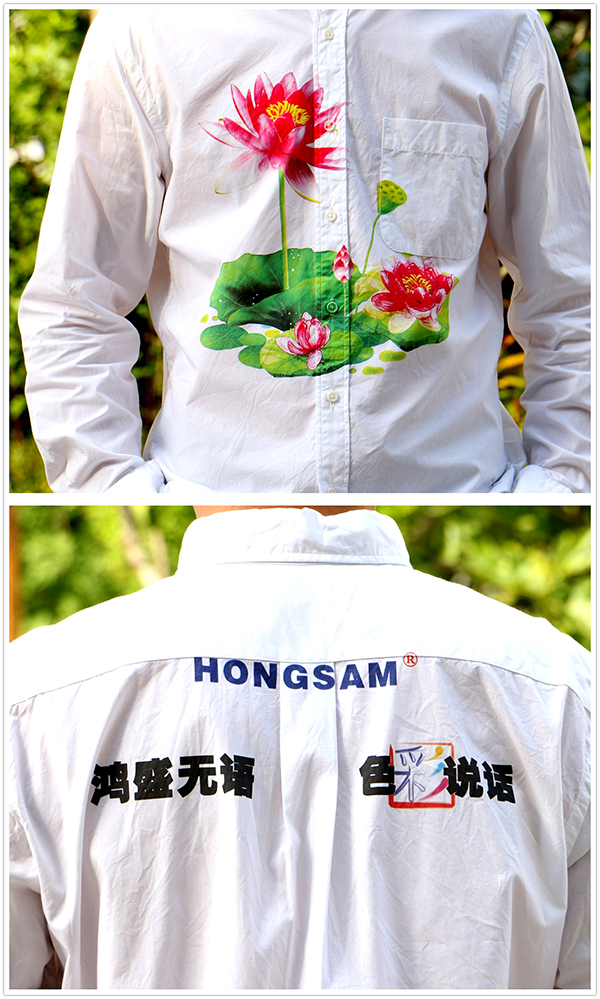 鴻盛參會(huì)人員身著“捷特絲”納米涂料墨水印花的成衣作品,倡導(dǎo)無(wú)水?dāng)?shù)碼印花工藝,展示時(shí)尚魅麗。服裝以“出水芙蓉”為主題,印花不僅體現(xiàn)出了荷花粉中帶白,荷葉蒼翠欲滴的視覺(jué)感官,圖案整體橫跨衣服門(mén)襟,實(shí)現(xiàn)真正意義上的成衣數(shù)碼印花。展會(huì)現(xiàn)場(chǎng),鴻盛數(shù)碼的“特色”團(tuán)隊(duì)服裝著實(shí)吸引了不少參展商。