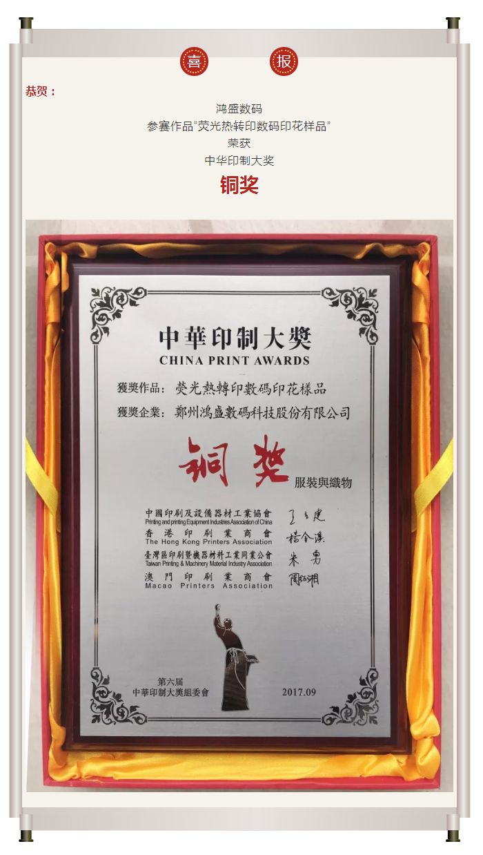 中華印制大獎迄今已經成功舉辦了六屆,是行業內經國務院批準的華人印刷界印刷獎項。參賽作品廣泛,涉及大陸及港、澳、臺和東南亞等地區,具有來自大陸、香港、臺灣、澳門的專業評審團,評審公開、公正,具有極高的公信力和權威性。該大獎得到了行業內的知名企業和全國各省印刷包裝協會及專業媒體的支持, 在2017年第6屆中華印制大獎中,鄭州鴻盛數碼的“熒光熱轉印數碼印花樣品”從數千件參賽作品中脫穎而出,榮獲了“中華印制大獎銅獎”。