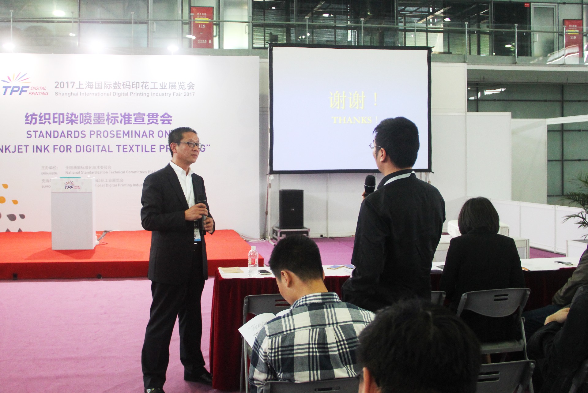 2017年4月20日,紡織品印染噴墨墨水行業(yè)標(biāo)準(zhǔn)宣貫會(huì)在2017TPF上海數(shù)碼印花工業(yè)展期間召開(kāi)。作為《紡織品印染噴墨 第1部分:活性染料墨水》、《紡織品印染噴墨 第4部分:顏料墨水》2項(xiàng)標(biāo)準(zhǔn)的第一起草單位,鴻盛數(shù)碼董事長(zhǎng)秦國(guó)勝就標(biāo)準(zhǔn)的制定歷程、標(biāo)準(zhǔn)重點(diǎn)內(nèi)容推介以及標(biāo)準(zhǔn)附錄解釋進(jìn)行了詳細(xì)的講解,并對(duì)現(xiàn)場(chǎng)專業(yè)人士的提問(wèn)做了解答。