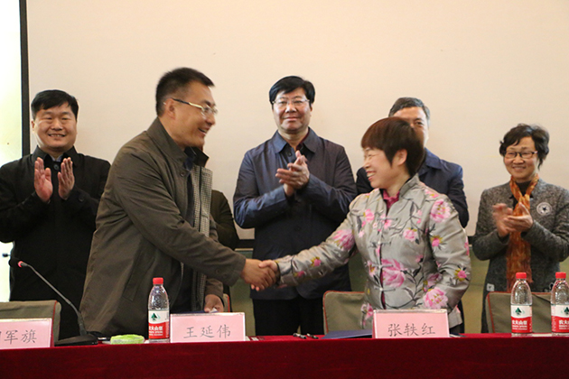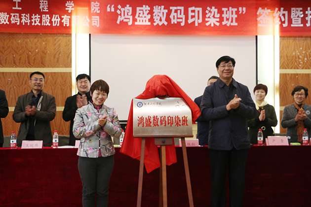 隨后,在現場熱烈的掌聲中,河南工程學院材料與化學工程學院院長和鴻盛數碼張軼紅簽署了“鴻盛數碼印花班”合作協議,河南工程學院黨委副書記耿廣智和鴻盛數碼董事張軼紅共同為“鴻盛數碼印染班”揭牌。