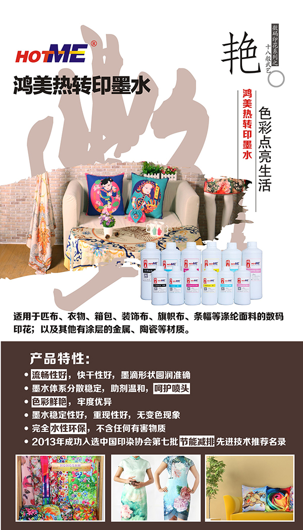 現場另有“鴻美”熱轉印墨水配套使用HJ-4195工業級高速紡織數碼印花機,機器采用工業級壓電5113噴頭,超高速、高精度打印。HJ-4195生產效率高,噴頭成本低,設備成本低,可大幅降低生產成本。