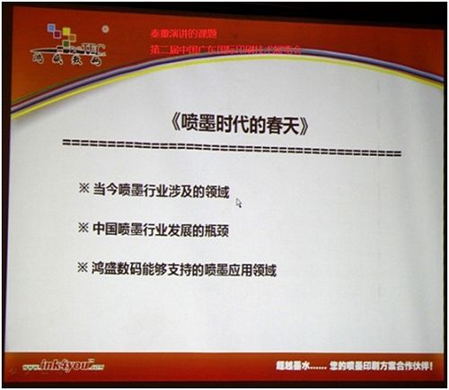 噴墨時(shí)代的春天”。演講的主要內(nèi)容為:當(dāng)今噴墨行業(yè)涉及的領(lǐng)域、中國噴墨行業(yè)發(fā)展的瓶頸、鴻盛數(shù)碼能夠支持的噴墨應(yīng)用領(lǐng)域。