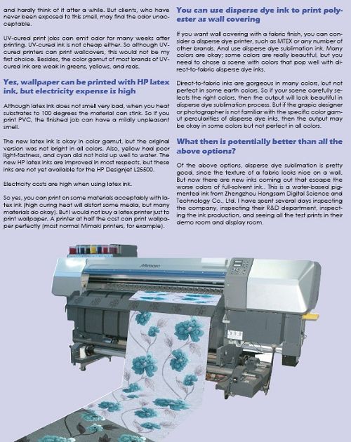 綜上所述,分散染料升華的方式是很好的,因為材料的紋理在墻上看起來很不錯。但是,現在有新的墨水出現了,它沒有溶劑墨水難聞的氣味,這就是鄭州鴻盛數碼科技股份有限公司生產的水性顏料墨水。我花了數天時間查看這個公司,查看他們的R&D部門和墨水生產過程,看了所有演示室和展覽室的測試打印。