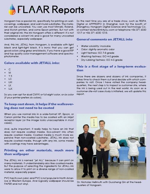 2011年年初,FLAAR Reports主任、高*編輯、噴墨專家Dr.Nicholas Hellmuth訪問鴻盛數碼工業園,對鴻盛數碼“科學.誠信.超越.環保”的企業理念贊許有加。Dr.Nicholas Hellmuth經過深入考察,科學嚴謹地撰稿,在《FLAAR Reports》推《HONGSAM wallpaper JETALL water-Based pigmented ink》(水性*能顏料墨水直接打印墻紙)。