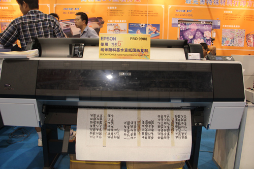 展會現場“鴻彩6®”四代顏料墨水(宣紙專用)穩定的物理結構和防水、耐光、抗紫外線的出色品質,借助EPSON 9908的配合輸出,*美呈現在一張張名家字畫上。