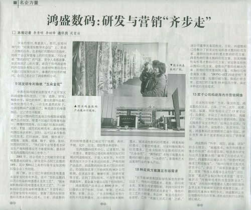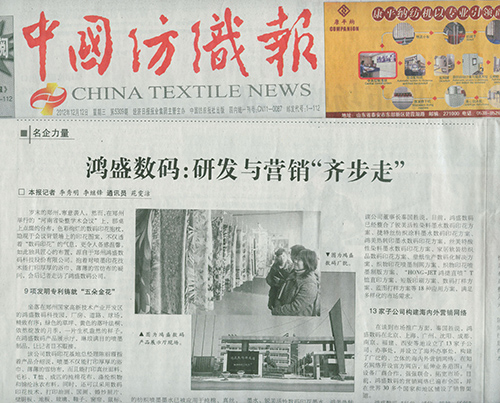 2012年12月12日,《中國紡織報》“名企力量”版塊對鄭州鴻盛數碼科技股份有限公司進行了專題報道。在今年的“河南省染整學術會議”上,鴻盛數碼作為河南數碼印花行業的代表企業,參與協辦了本次學術會議。鴻盛數碼為會議現場充滿“數碼印花”氣息的布置,關于先進的無水、節水數碼噴墨印花方案的詳細介紹,以及鴻盛數碼安排的總部實地參觀,給參加“河南省染整學術會議”的專家及學者留下了很深的印象。《中國紡織報》作為中國紡織行業綜合性大報,隨后對鴻盛數碼進行了專訪。