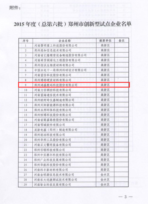近日,鄭州市科技局公布了第六批創新型試點企業名單,鴻盛數碼名列其中。