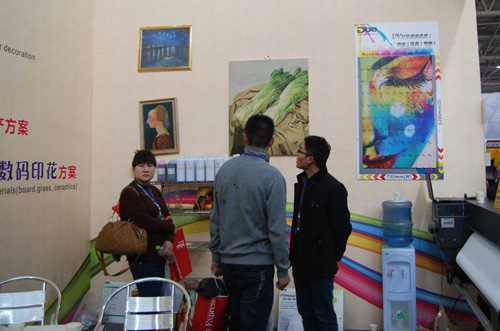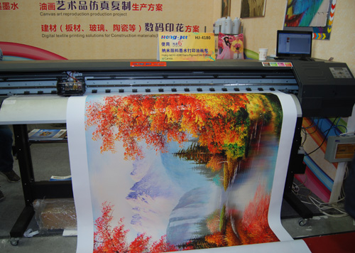 HJ-4180使用“鴻彩6®”四代顏料墨水打印油畫布方案;噴墨作為藝術品復制的重要手段,在近幾年的數字印刷中發揮著膠印無法取代和超越的重要作用。2010年鴻盛數碼推出“鴻彩6”四代油畫布專用納米顏料墨水,墨水采用了VM鮮艷紅色彩系統,高密度黑色、牢度及廣泛的介質適應性,尤其適合藝術品復制。經過市場的長期考驗,“鴻彩6”四代顏料墨水打印油畫布方案加之專業的配套服務,已經得到業內人士廣泛認可。HJ-4180采用新型第五代微壓電打印技術,配合VSDT可變墨滴技術,墨滴細密,可重現高品質圖像的精致細節。此次北京墻紙壁布展,HJ-4180使用“鴻彩6”四代油畫布專用納米顏料墨水打印油畫布,如虎添翼,呈現古文化的經典與高雅,為藝術愛好者帶來了高品質的視覺享受,吸引
