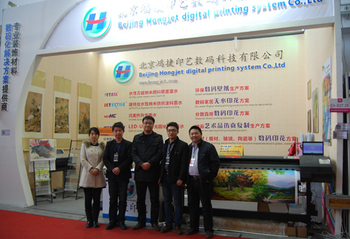 鴻捷印藝數碼科技有限公司攜完善的家裝方案亮相此次北京墻紙壁布展,現場為觀眾演繹了當下家裝方案中先進的噴墨技術與古典藝術品的混搭。
