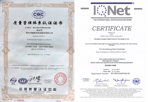 ISO9001:2008質量體系標準,是世界質量管理知識和方法的精華。鴻盛數碼將繼續認真貫徹體系要求,進一步提高全員質量意識,持續改進,穩定產品質量,提升顧客滿意度,為“成為世界知名的噴墨墨水研發生產商”而努力!