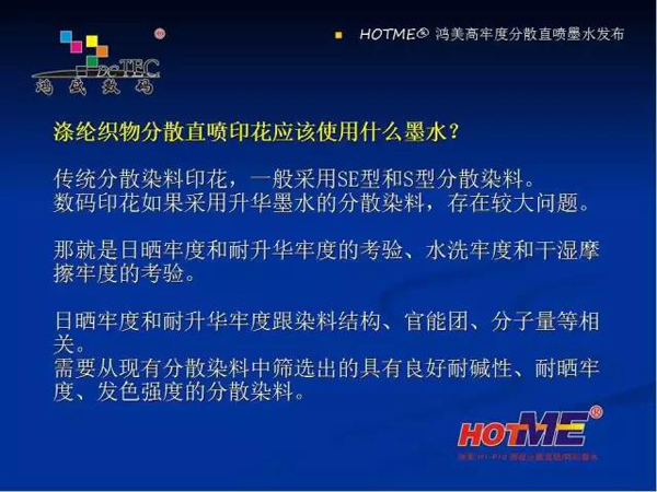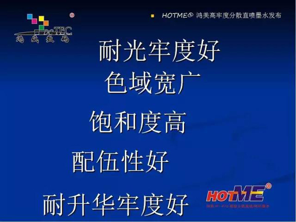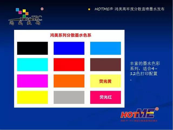 現在鴻盛數碼推出的有四款分散墨水:分別是熱轉印墨水,高日曬熱轉印 / 分散直噴墨水,高溫分散直噴墨水,HF 型(免水洗)分散直噴墨水。適合在滌綸、可染滌綸、丙綸上的數碼印花。下面重點