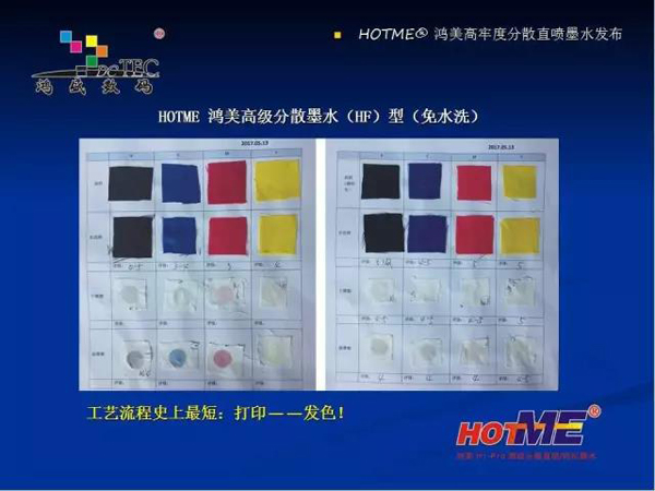 該款墨水的特點是:對于沒有水洗設備的工廠,或者不適宜進行水洗的面料,發色后不需要水洗即可以滿足對于摩擦色牢度的要求。