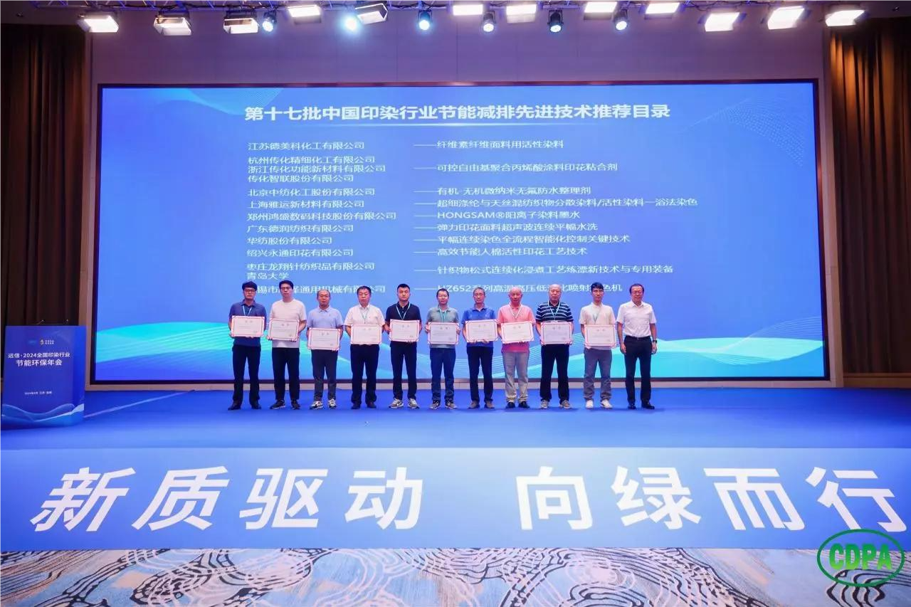 2024年8月14-16日,由中國印染行業(yè)協(xié)會主辦的“遠(yuǎn)信·2024全國印染行業(yè)節(jié)能環(huán)保年會”在江蘇鹽城舉行。鴻盛數(shù)碼“HONGSAM®陽離子染料墨水”入選《第十七批中國印染行業(yè)節(jié)能減排先進(jìn)技術(shù)推薦目錄》。