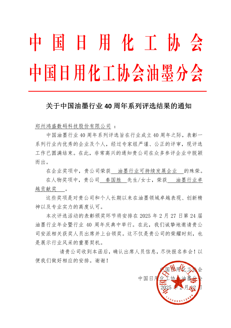 2025年2月26日至28日,第二十四屆全國油墨行業年會暨油墨行業40周年慶典活動在杭州隆重舉行。在這場匯聚行業精英的盛會中,鴻盛數碼榮獲“油墨行業可持續發展企業”,公司創始人、董事長、總經理秦國勝先生榮獲“油墨行業卓越貢獻獎”。