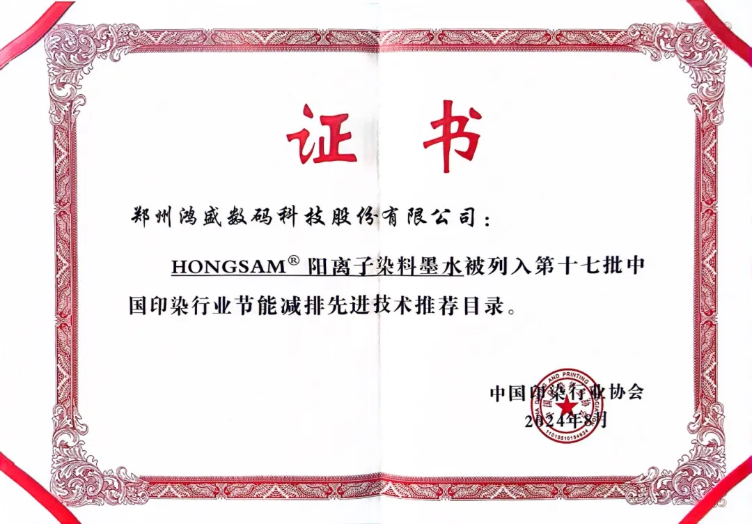 ?2024年,“HONGSAM®陽離子染料墨水”入選第十七批中國印染行業節能減排先進技術推薦目錄