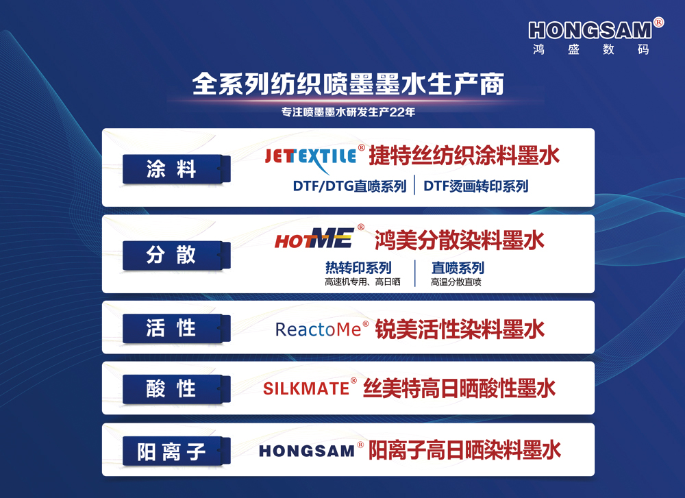 鴻盛數(shù)碼,一家擁有 22 年專業(yè)研發(fā)生產(chǎn)噴墨墨水經(jīng)驗(yàn)的企業(yè),在本次展會(huì)不僅展示了旗下的全系列紡織噴墨墨水產(chǎn)品("捷特絲?"紡織涂料墨水、“鴻美?”分散染料墨水、“銳美?”活性染料墨水、“絲美特?”酸性染料墨水、“HONGSAM?”陽(yáng)離子染料墨水),還有JETALL?水性環(huán)保乳膠墨水打印方案和鴻捷全數(shù)碼柯式燙畫解決方案。
